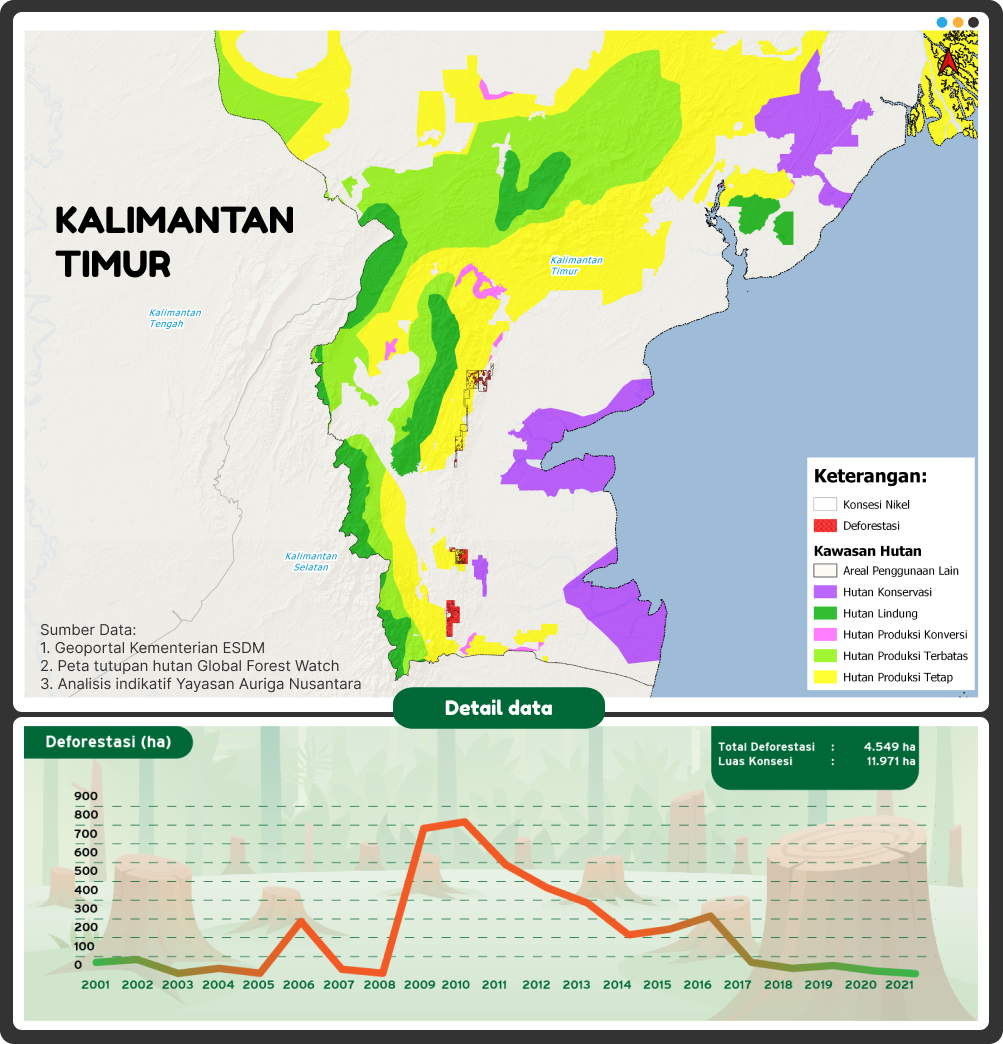 Perusahaan-perusahaan nikel di Indonesia sudah berupaya menjalankan tanggung jawab lingkungan mereka untuk memulihkan hutan. Tapi, tetap saja, dalam rentang 2001 hingga 2021, hutan alam yang terdeforestasi tercatat seluas 333.409 hektare.